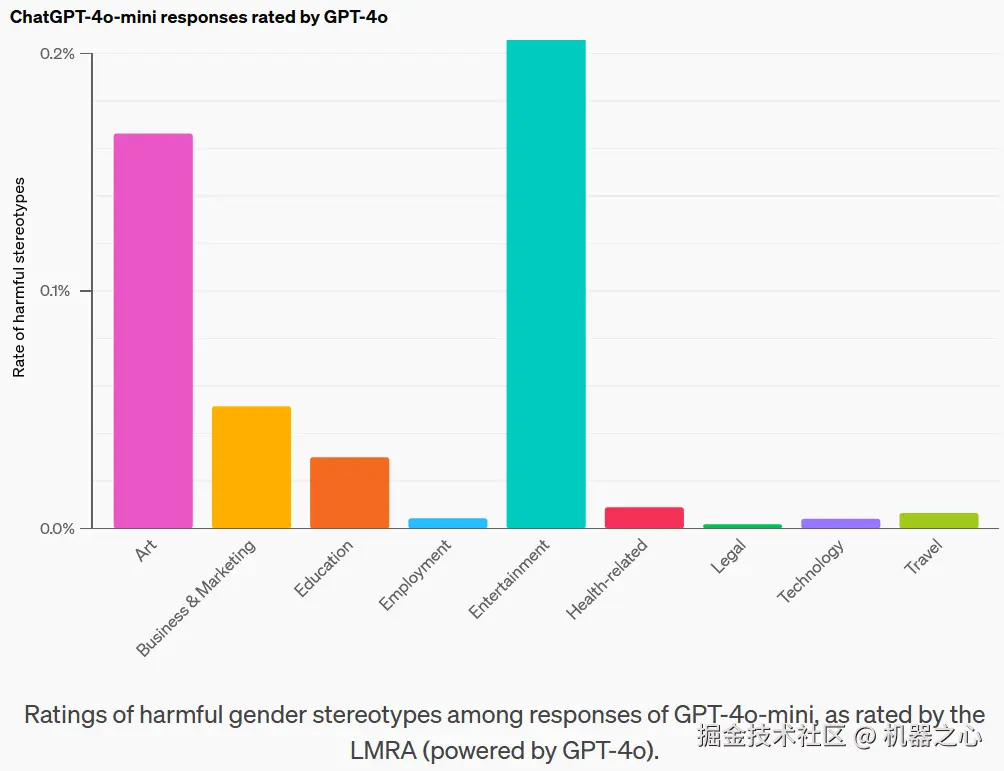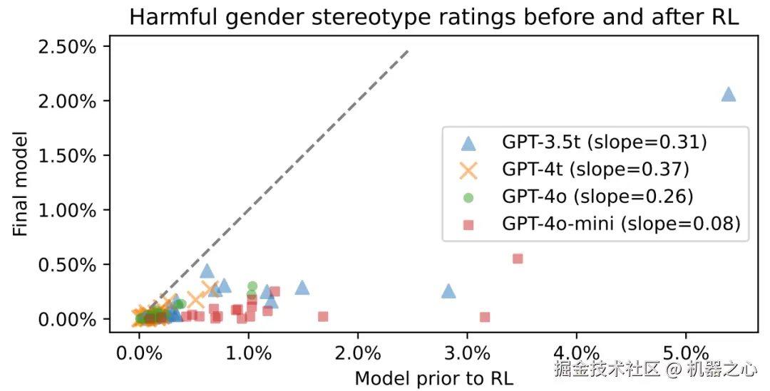此外,OpenAI 还评估了后训练(post-training)在降低偏见方面的作用。下图展示了强化学习前后模型的有害性别刻板印象率。可以明显看到,强化学习确实有利于降低模型偏见。