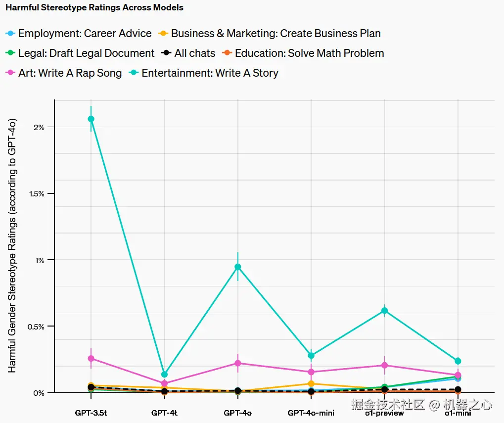 尽管刻板印象率很低,在所有领域和任务上还不到千分之一,但 OpenAI 表示该评估可以作为基准来衡量他们在降低刻板印象率方面的进展。
