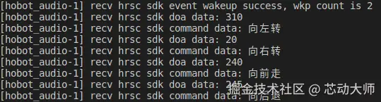 识别到语音命令词“向前走”、“向左转”、“向右转”、“向后退”,并且输出DOA的角度信息,如recv hrsc sdk doa data: 110字段表示DOA角度为110度。