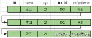 当事务103(trx_id=103)执行了 update t_user set name='王五' where id=1; 之后: