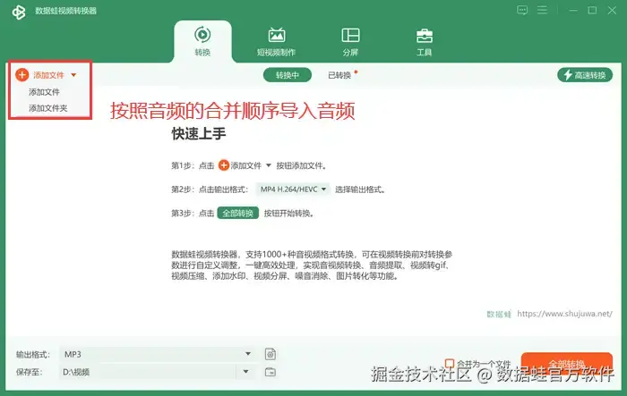 我们已经不再只满足于听一首歌了,掌握音频合并迫在眉睫!怎么把mp3合并?数据 蛙视频转换器是一款值得信赖的音视频处理软件,除了基本的格式转码外,还提供了音视频的剪辑、合并、噪音消除等功能。