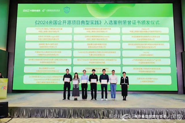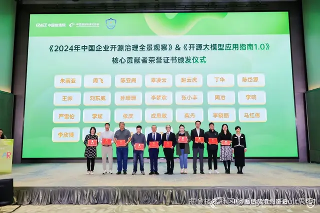 中国信通院还在会上发布了《2024央国企开源项目典型实践》、《2024年中国企业开源治理全景观察》、《开源大模型应用指南1.0》、伏羲·开源安全管控服务一体化平台等多项成果,为企业安全、合规、高效地使用开源技术提供了标准和案例参考。 会上为入选《2024央国企开源项目典型实践》案例的典型企业代表以及《2024年中国企业开源治理全景观察》与《开源大模型应用指南1.0》核心贡献者代表举行了颁证仪式。