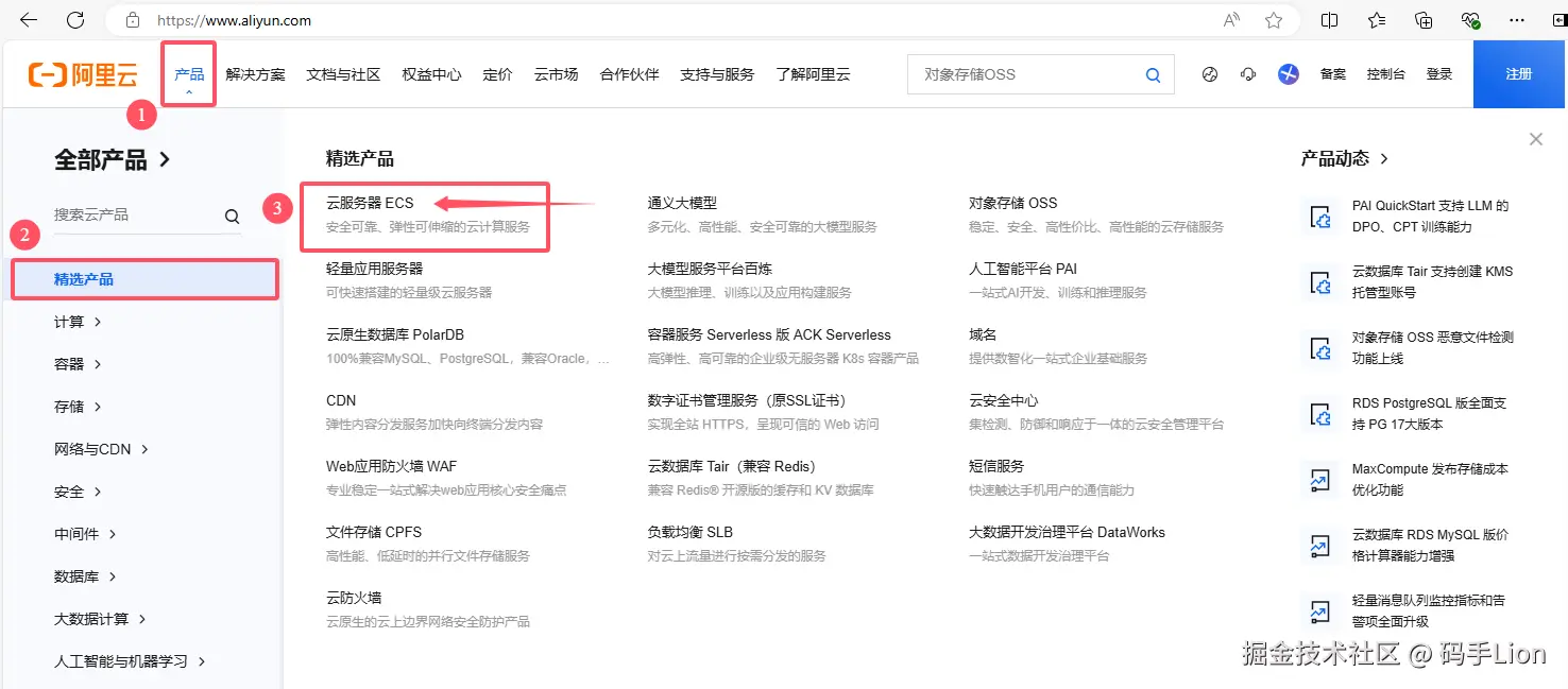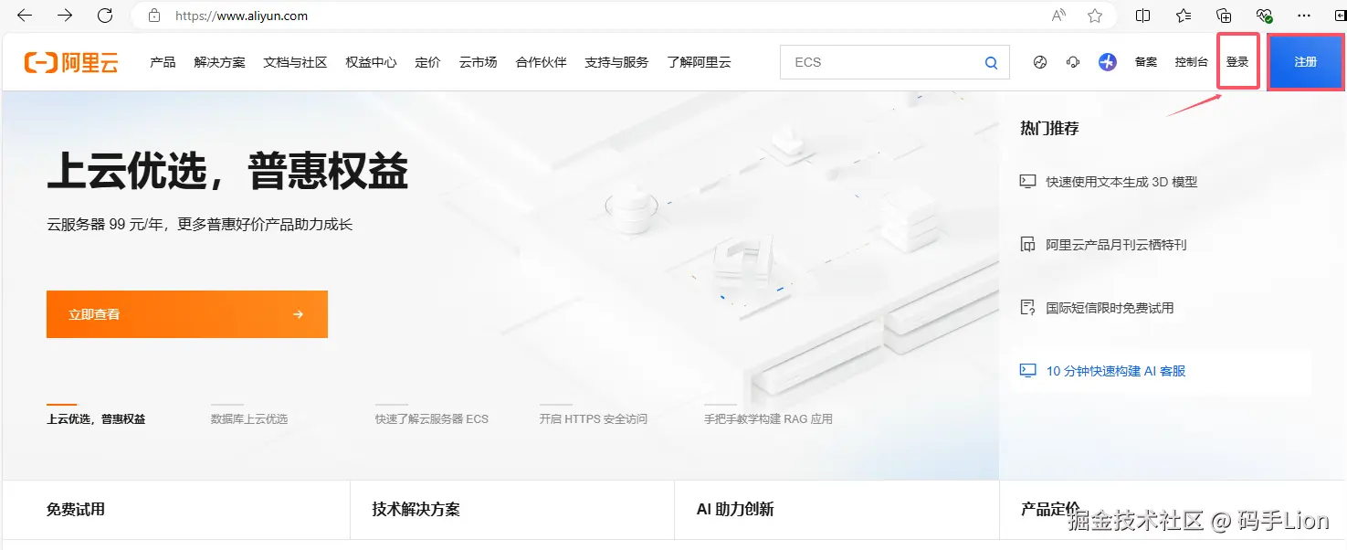 1、访问阿里云官方网站:www.aliyun.com,并登录,登录之后,导航至服务器产品页面 (ECS);
