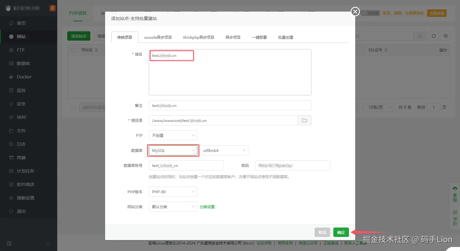 - 数据库:选择 MySQL 数据库选项。系统会自动生成一个数据库账号及其密码,请务必记录下来(也可以通过左侧导航栏中的【数据库】选项来查看)。这些信息将在后续安装过程中用到;