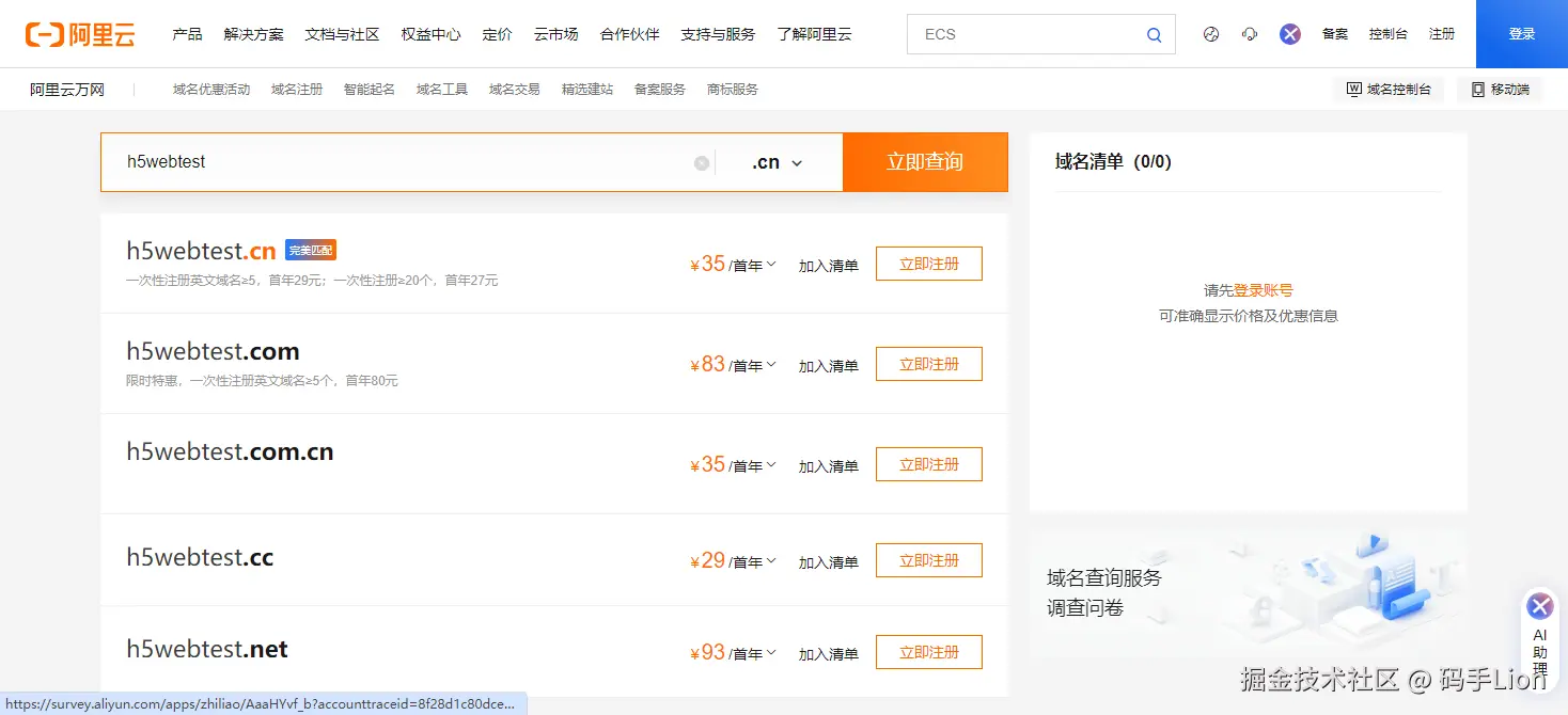 2、查询自己域名是否已被他人注册,如果确认尚未被注册,则立即进行注册;