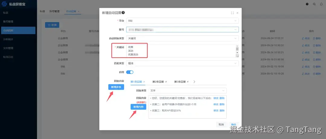 比如,通过设置关键词回复,我们只需设置几个关键词和几段想要发送的消息,并且可以根据需要自定义添加多条回复内容,数量不限。当用户私信内容触发关键词时,该插件会立即自动回复,有效应对大量消息。