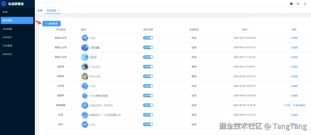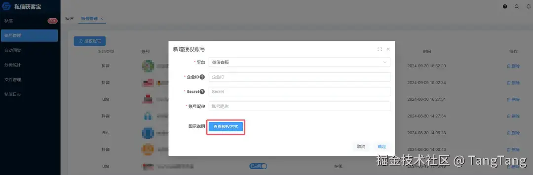 账号管理提供了插件和 API 两种接入方式。安装「私信获客宝插件」后,平台账号与私信获客宝账号会在登录后自动关联。而 API 方式则通过扫码授权或 API 配置,实现安全连接。这两种方式不仅简化了账号管理流程,还增强了灵活性与安全性。详细操作可点击“查看授权方式”了解更多。