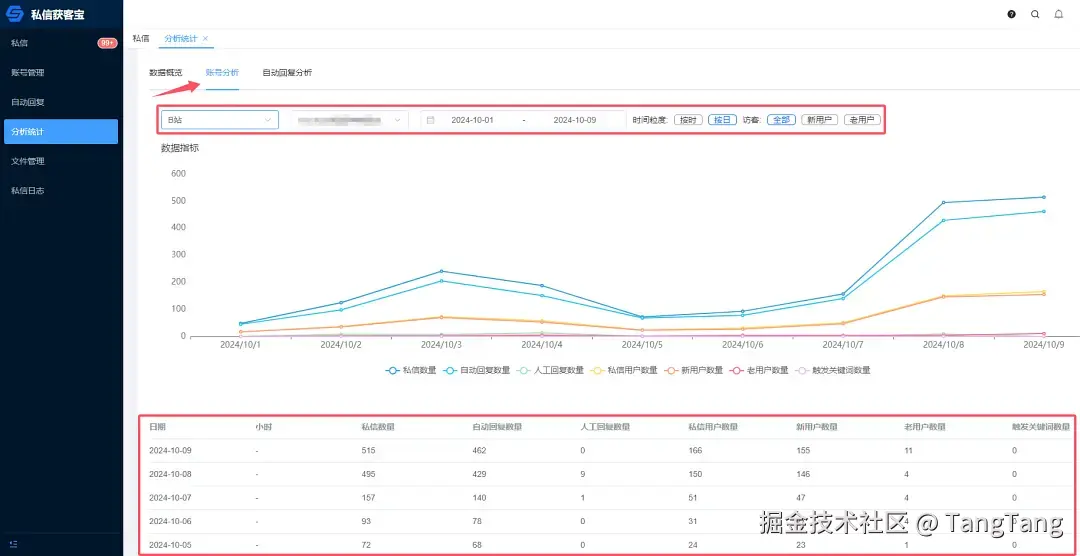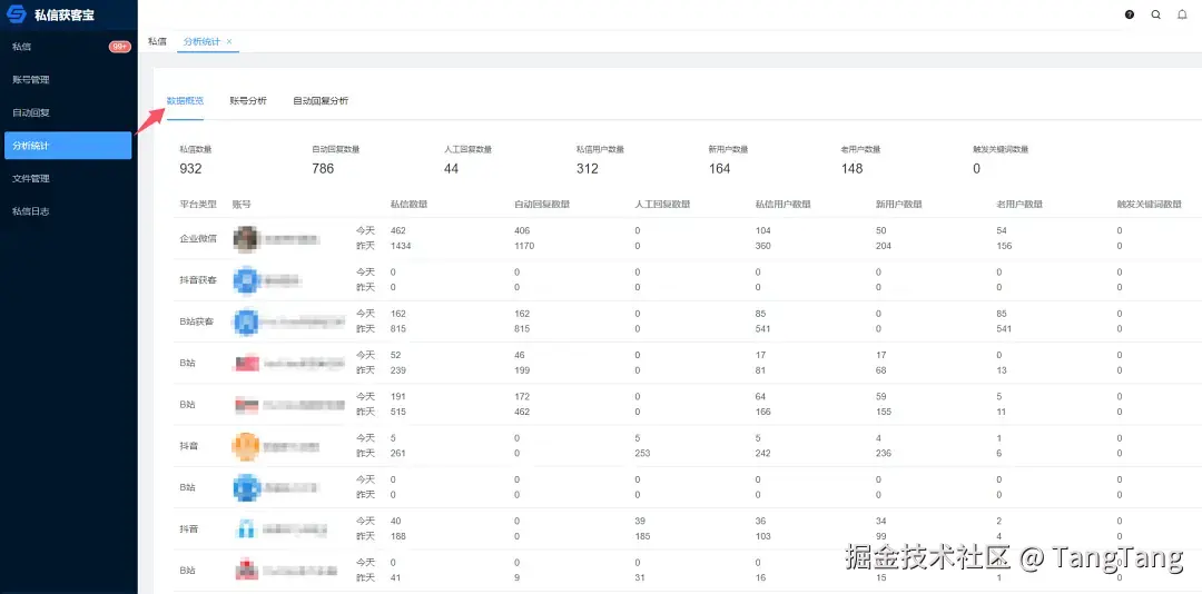 在新媒体运营中,数据分析非常重要。「私信获客宝插件」提供了全面的数据分析工具,包括数据概览、账号分析和自动回复分析三大模块。通过「数据概览」,我们可以直观地查看所有平台在最近两天内的私信数量、自动回复数量、人工回复数量、私信用户数量、新用户和老用户数量,以及触发的关键词数量。
