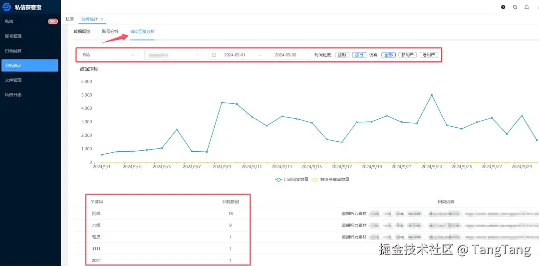 「自动回复分析」功能则帮助用户掌握不同平台账号在指定时间内的自动回复情况,包括数据趋势和关键词使用频率。