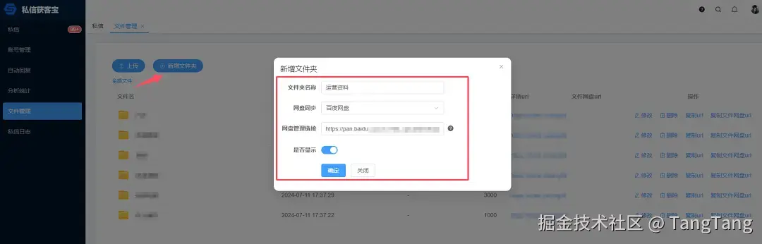 「私信获客宝插件」的文件管理工具支持自动从多个第三方网盘(如百度网盘、阿里云盘、夸克网盘)同步文件目录结构,并自动生成网盘分享链接和编号。无需手动操作即可确保文件始终更新。