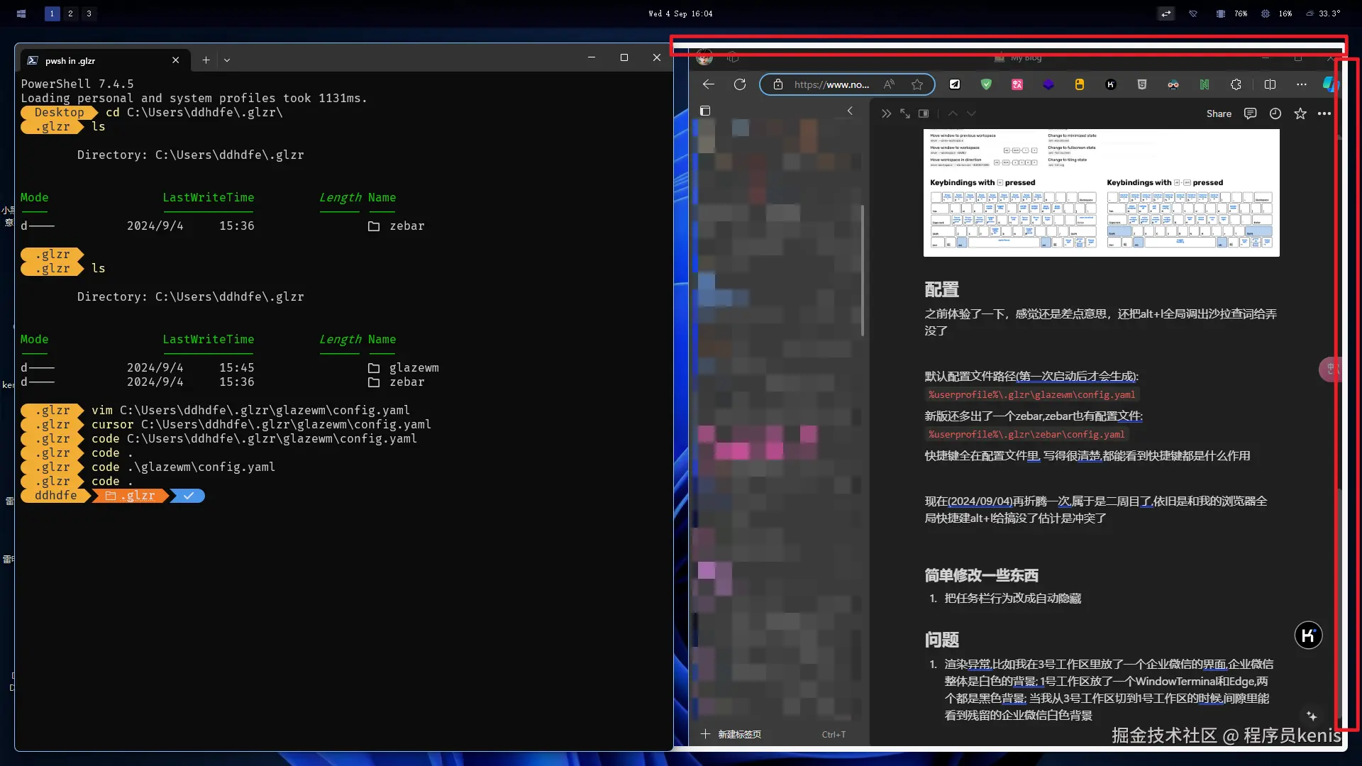 现在(2024/09/04)再折腾一次,属于是二周目了,依旧是和我的浏览器全局快捷建alt+l给搞没了,冲突了,打开GlazeWM之后如果需要使用带ALT键的快捷键,要么使用alt+shift+p 暂时禁用GlazeWM的所有快捷键,要么就只能修改冲突的快捷键,比如在VSCode里面我有很多跟alt相关的快捷键,在使用VSCode的时候我就只能先禁用GlazeWM的所有快捷键