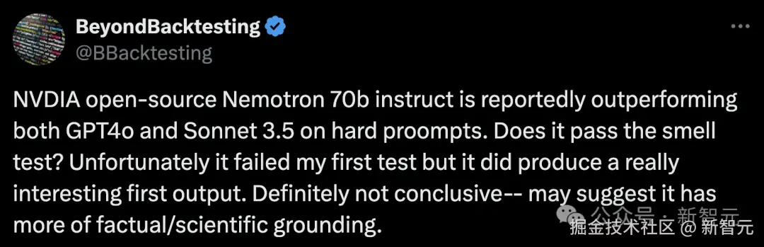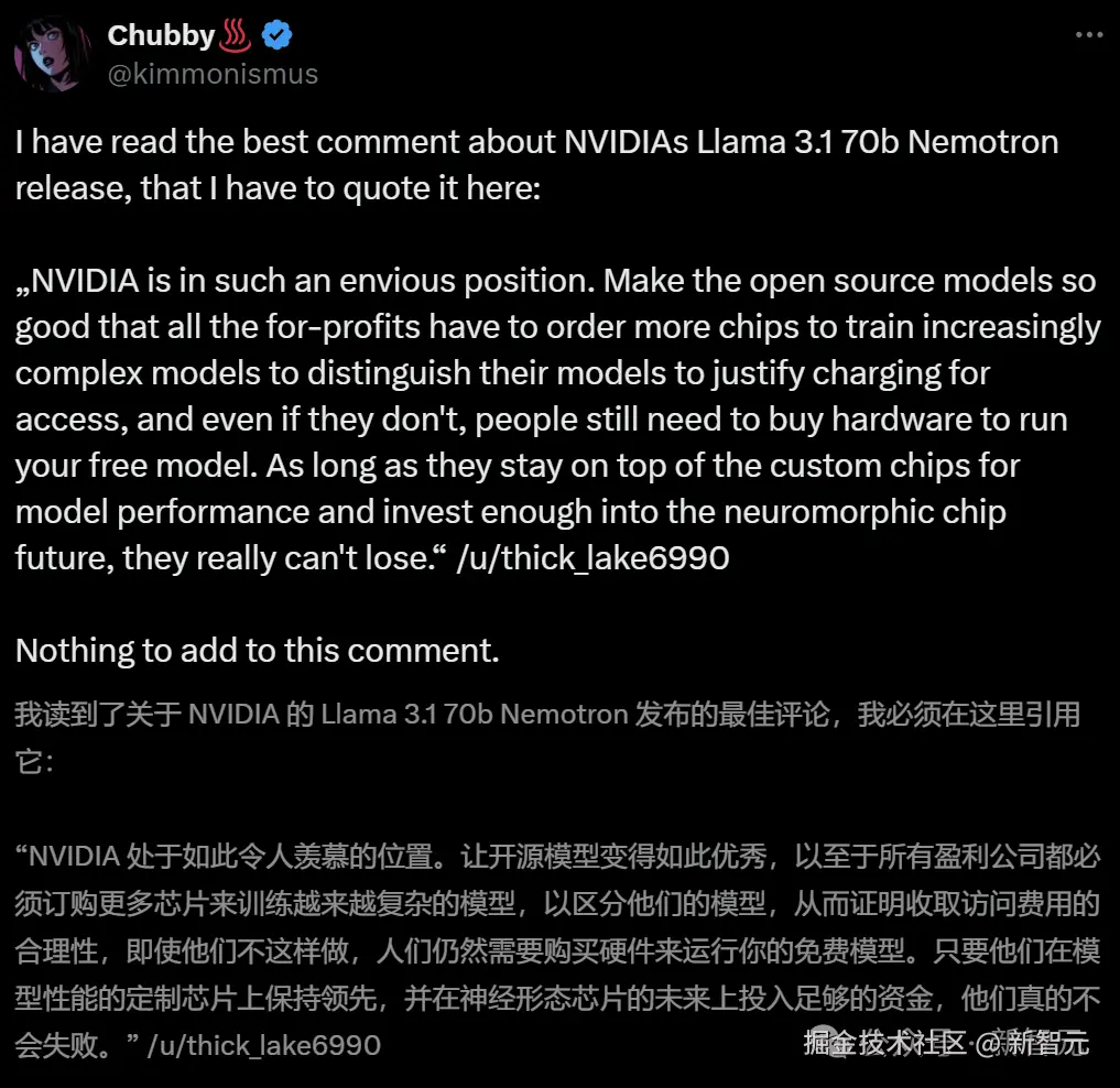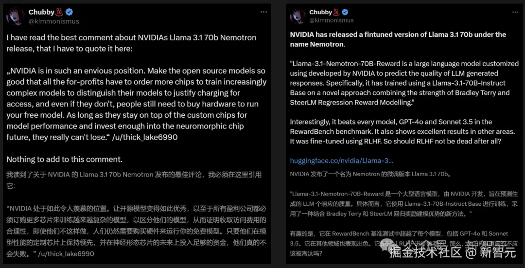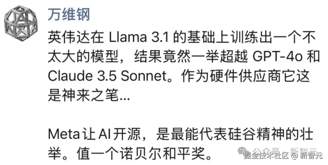 业内人士评价:英伟达在 Llama 3.1 的基础上训练出不太大的模型,超越了 GPT-4o 和 Claude 3.5 Sonnet,简直是神来之笔。