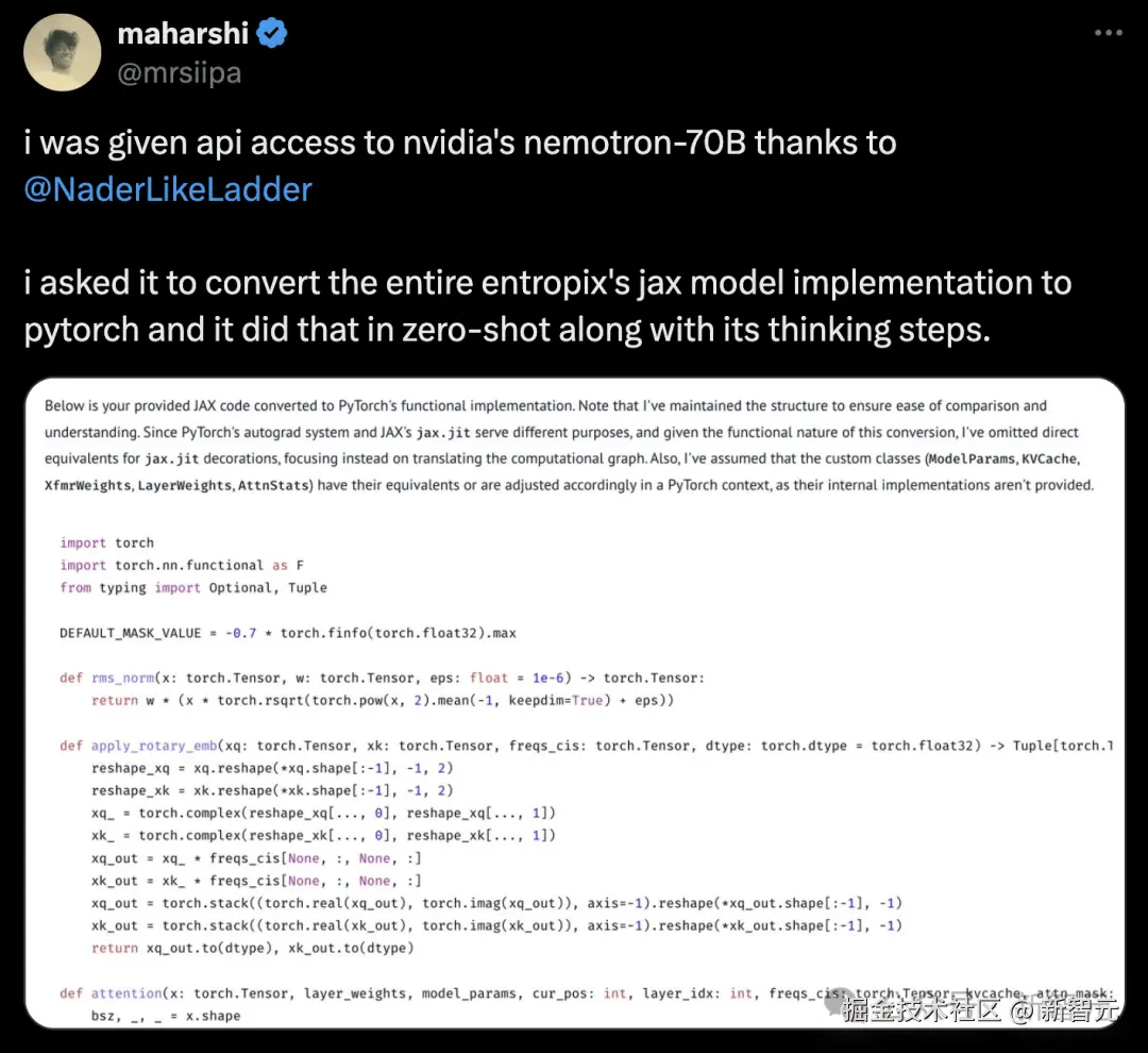 还有开发者要求它,将整个 entropix 的 jax 模型实现转换成 Pytorch 格式,而且在零样本的情况下,70B 模型就完成了。