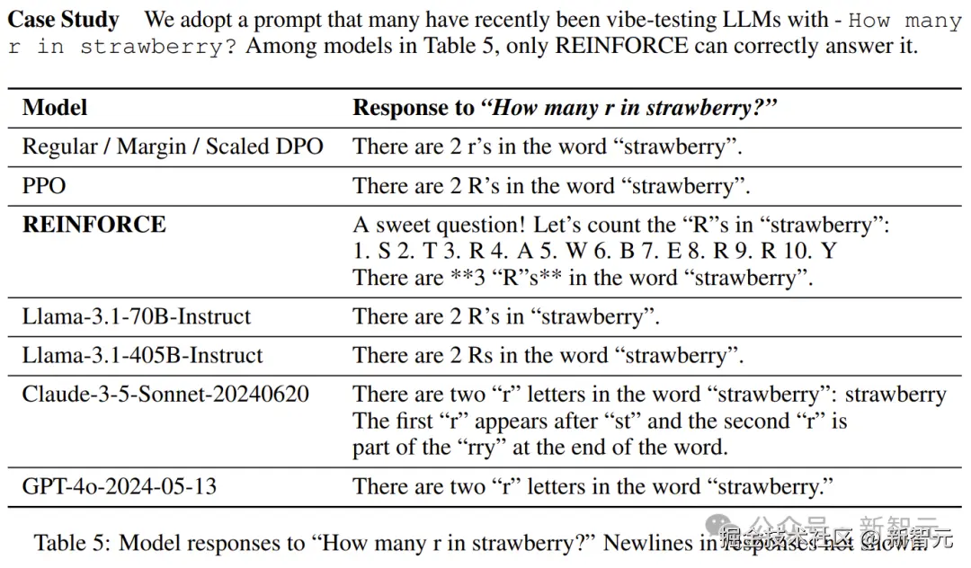 如表 5 所示,对于「Strawberry 中有几个 r」这个问题,只有 REINFORCE 能正确回答这个问题。
