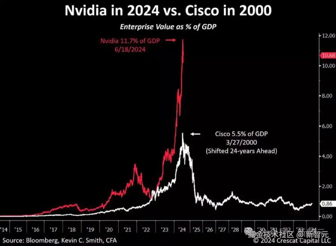 现在,英伟达占美国 GDP 的 11.7%。而在互联网泡沫顶峰时期,思科仅占美国 GDP 的 5.5%