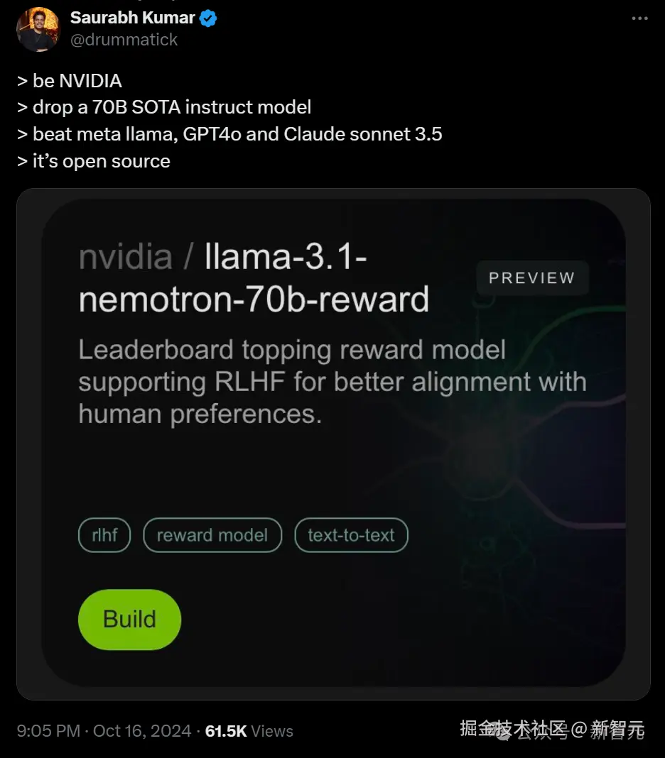 【新智元导读】就在刚刚,英伟达开源了超强模型 Nemotron-70B,后者一经发布就超越了 GPT-4o 和 Claude 3.5 Sonnet,仅次于 OpenAI o1!AI 社区惊呼:新的开源王者又来了?业内直呼:用 Llama 3.1 训出小模型吊打 GPT-4o,简直是神来之笔!