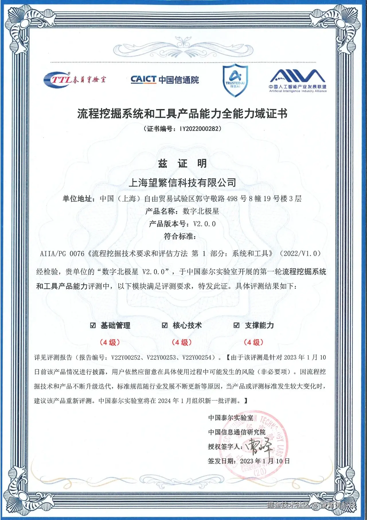 中国信通院公布第七批“可信AI”评测结果。望繁信科技旗下流程智能平台数字北极星,通过“流程挖掘系统和工具产品能力”全能力域4级评测,基础管理、核心技术、支撑能力均达到目前最高等级!