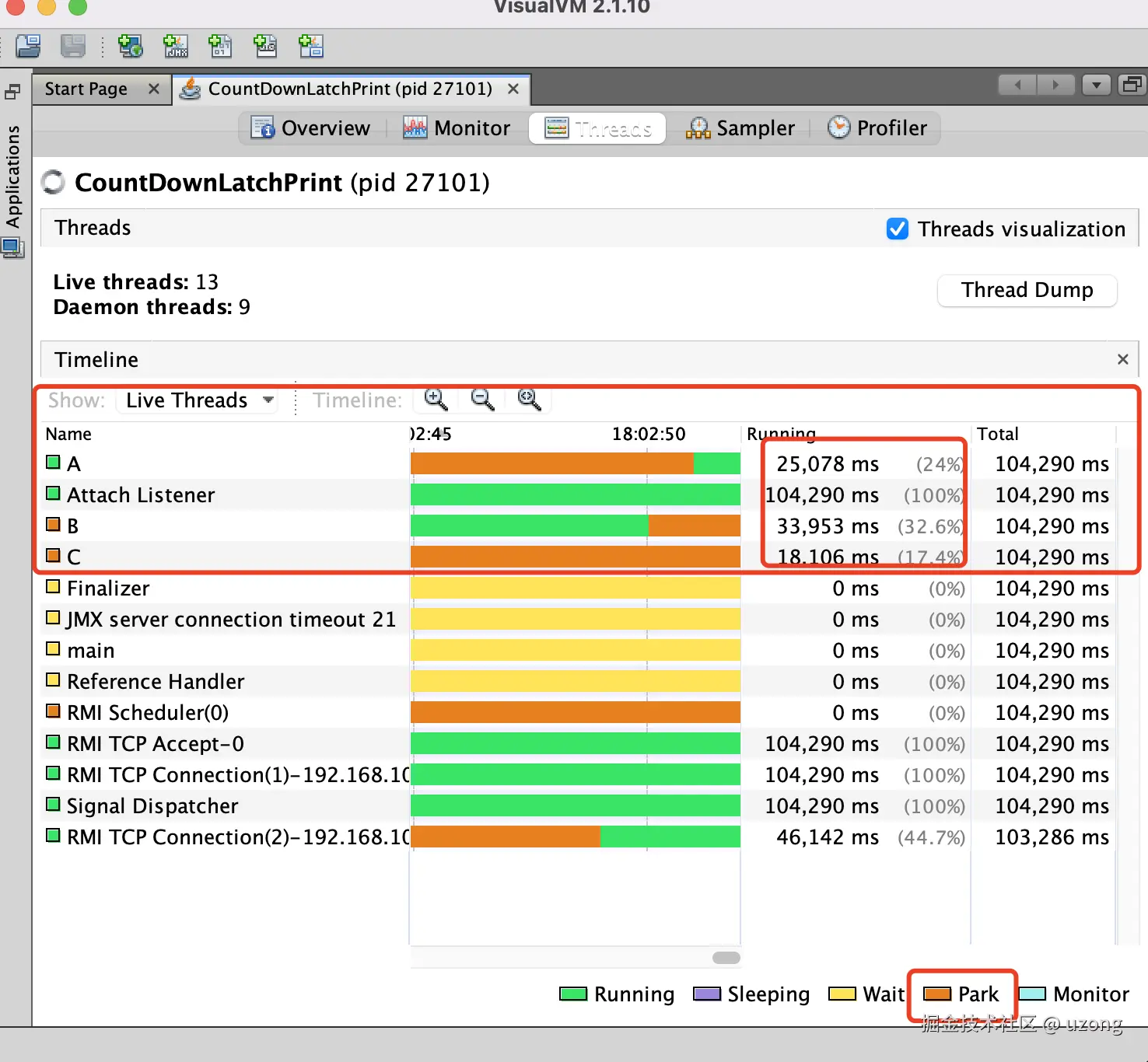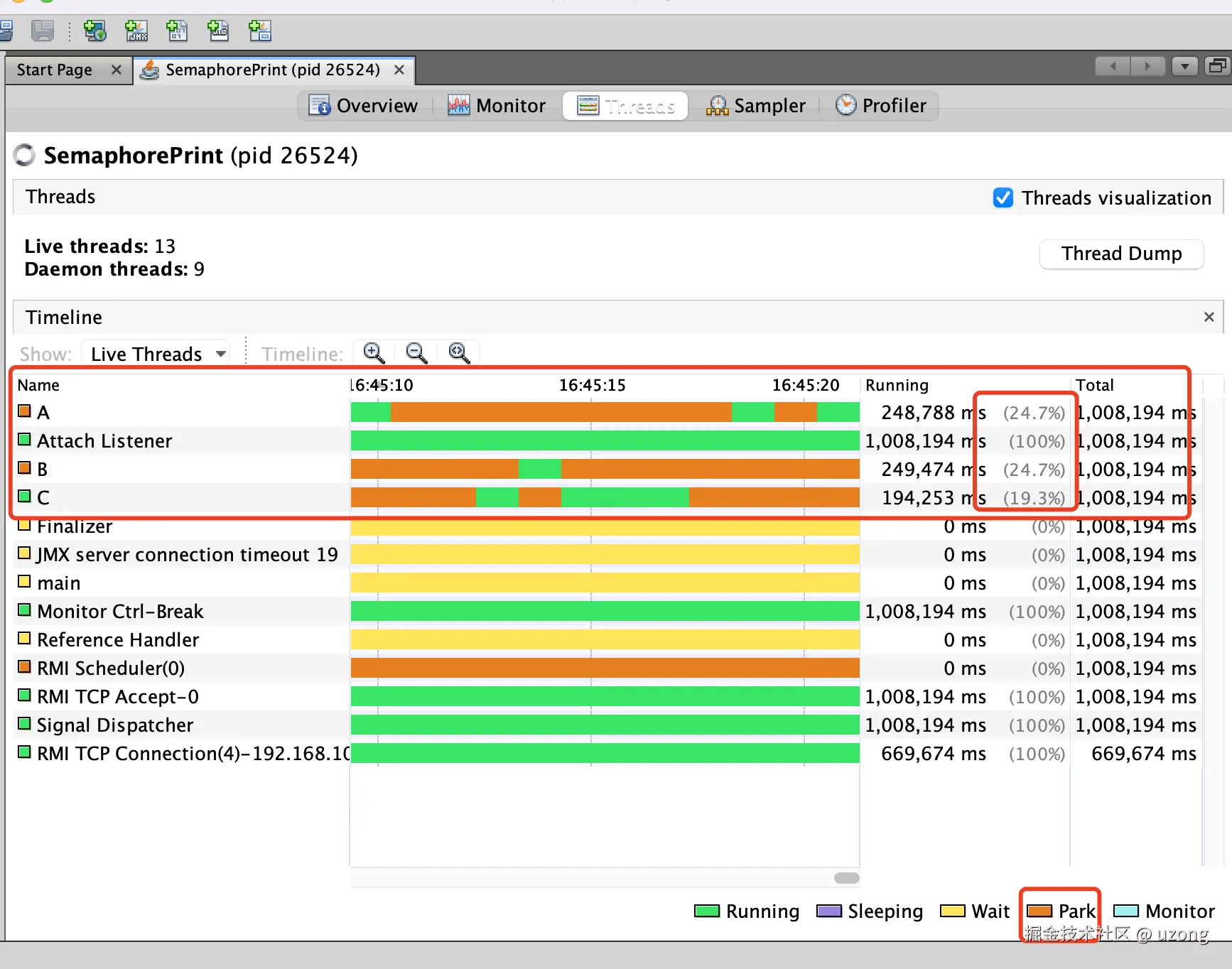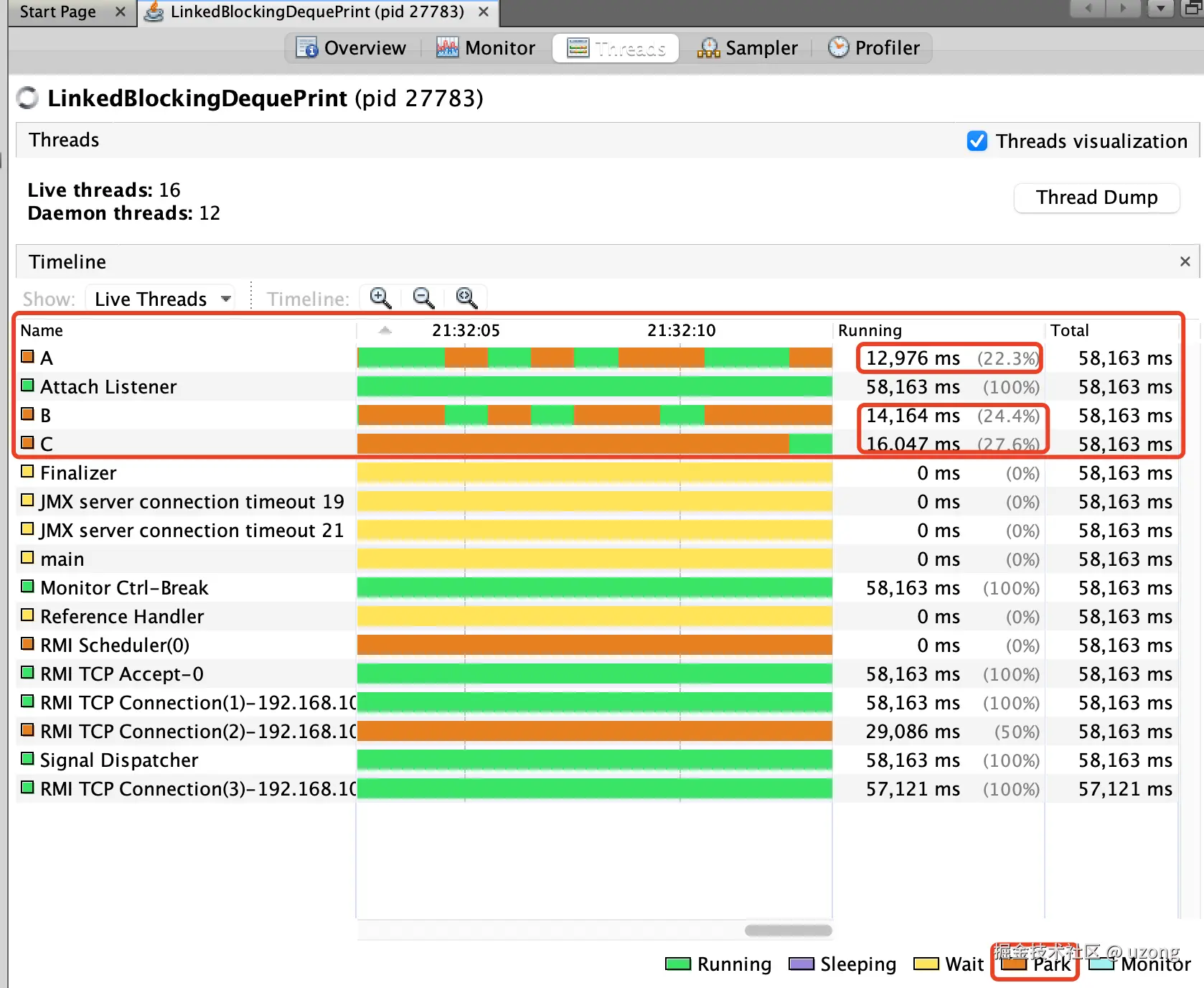 因此从理论上:C 线程 running 状态时间最长 (目前只能使用 CyclicBarrier 写出这样的代码)