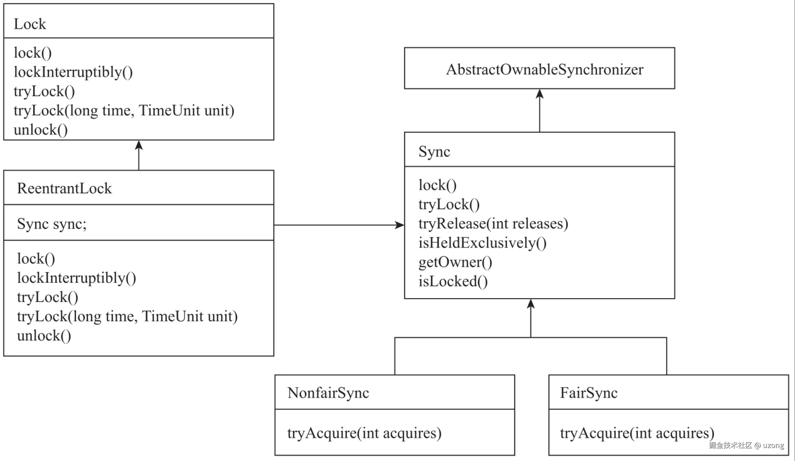 ReentrantLock 借助了 AQS 的能力(AQS 被使用得太多,后续会单独章节讲解),从而实现了上面功能。