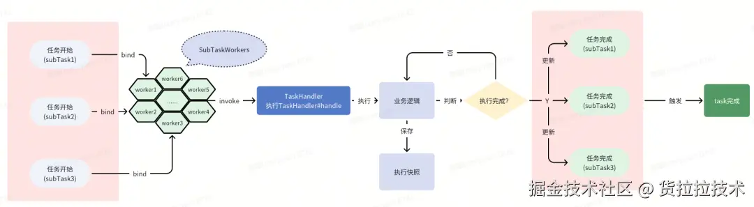 在执行任务时,TaskManager会从执行线程池SubTaskWorkers获取执行线程并绑定SubTask对象,然后通过调用TaskHandler#handle方法执行子任务,handle方法的内容就是具体业务逻辑代码。(归档引擎的核心代码)