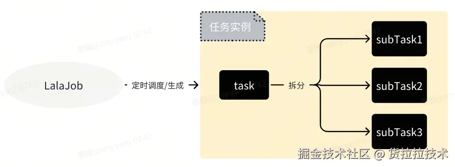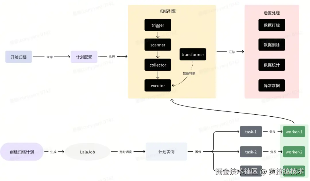 LaLaJob会定时进行任务调度,调度成功后会生成一个归档实例,然后基于调度中心的任务拆分模块,将实例按照事先分配的并发数拆分成多个任务,在拆分同时会基于归档引擎的trigger组件构建各自的扫描条件,然后自动分配给节点并在工作时间内进行执行。