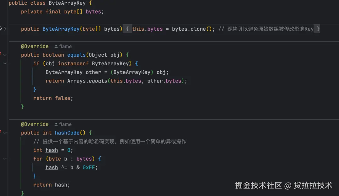 由于byte[] 内容一样,引用不同导致认为是2条数据,最终落到HBase中是2行数据,导致数据异常(比如订单地址表信息等1对多的表)。因此我们采用重写byte[]的equals和hashcode方法,内容一样就认为是一样的。