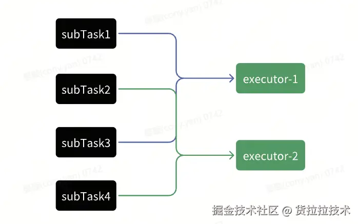 基于pod(excutor)的数量和子任务的数量进行平均分配。默认采用短板规则绑定(即取最少子任务绑定数量的executor),目前仅提供这一种策略。