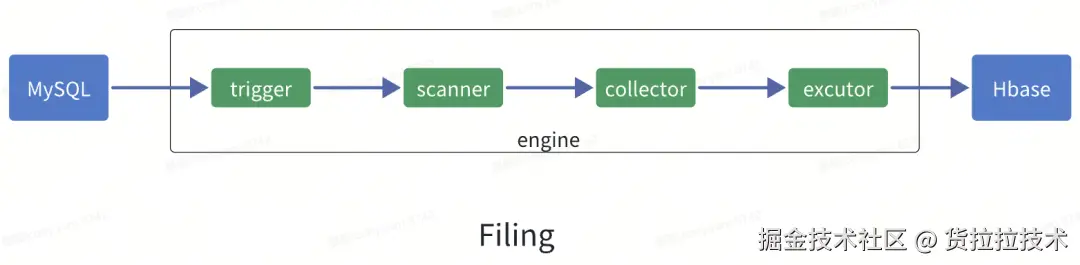 Filing的核心是由1个引擎4个组件构成。将数据源读取和写入抽象成为trigger+scanner以及colletor+excutor组件,并将其纳入到整个归档框架中。