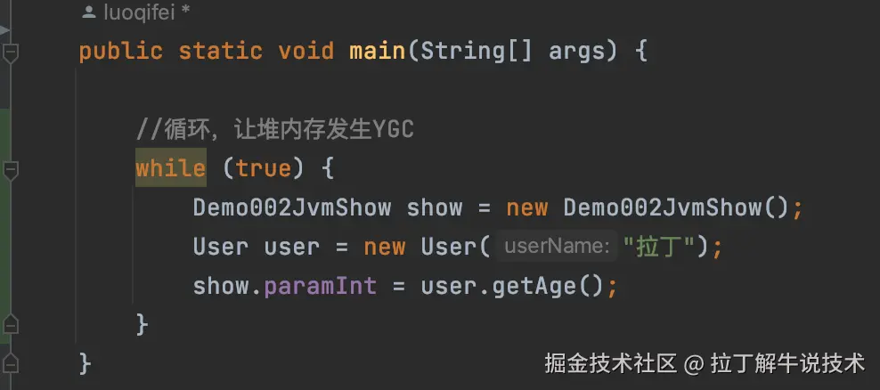 如果你的对象被局部变量、或者类的静态变量引用,GC就不会回收。比如当前执行到方法的show.paramInt = user.getAge(); 里面对象user,由于有main线程的虚拟机栈的user变量引用,这时候YGC是不会回收堆内存里的User对象。