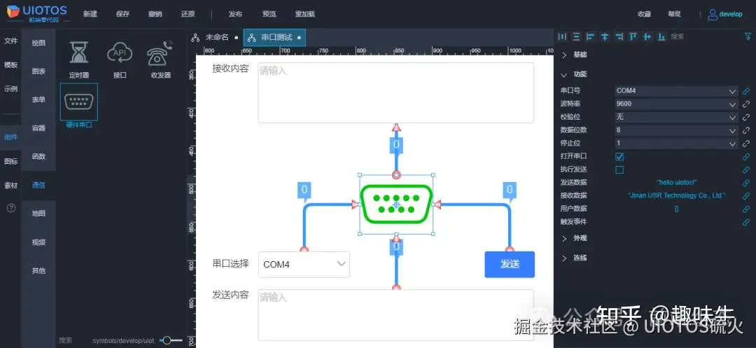 打开工具,拖放串口组件,与UI组件连线,就能搭建带有交互界面、串口读写的简单上位机应用——网页串口工具。如下所示: