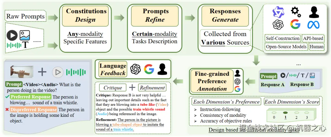 从流程图可以看到,首先设计针对各种模态量身定制的特征,根据特定的模态任务及其相应的特征,以优化部分较低质量的原始提示,以得到最终版本的问题,同时从多个来源收集回答(包括根据特性构造偏序问答对、调用开源和闭源模型以及使用人工生成答案)。