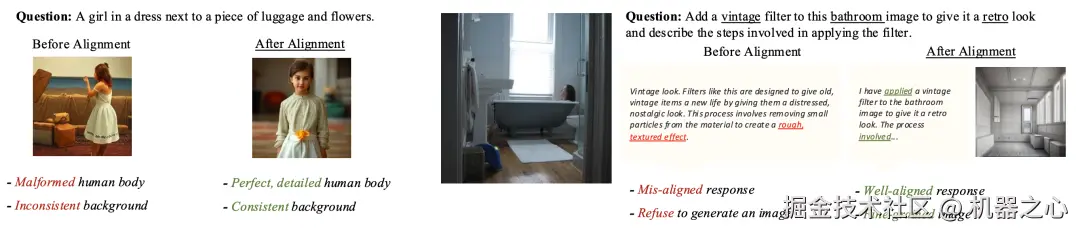 在图文联合输入 / 输出评测中,对齐后模型和对齐前模型比较,GPT-4o 评测胜率超过 80%。以下为对齐前后的一些实例比较: