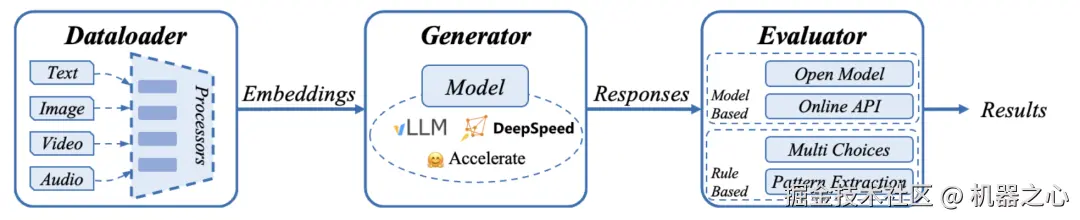 为了方便集成自定义评测集,Align-Anything 对评测框架进行了高度解耦。该框架主要由 DataLoader、Generator 和 Evaluator 三部分组成。DataLoader 负责加载和预处理多种评测集,转化为适合推理的数据格式;Generator 负责使用不同的推理框架生成结果;Evaluator 则对生成的结果进行评估并输出评分。