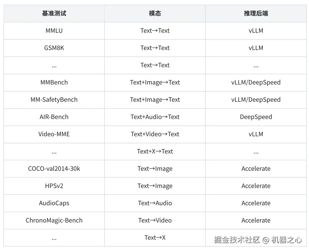 支持多种开、闭源对齐评估:支持了 30 多个多模态评测基准,包括如 MMBench、VideoMME 等多模态理解评测,以及如 FID、HPSv2 等多模态生成评测。