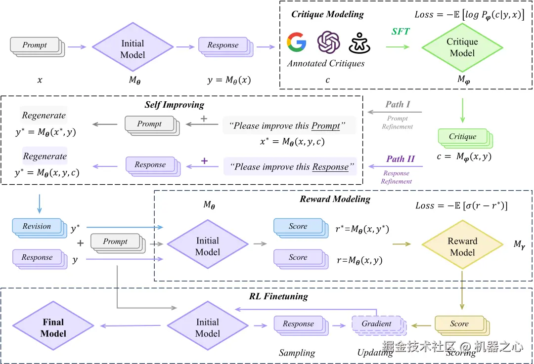 模型自提升:令初始模型在给定好 prompt 的数据集上生成一系列 response,再利用评论模型对此生成的评论,令初始模型针对自身的 response 进行修正。