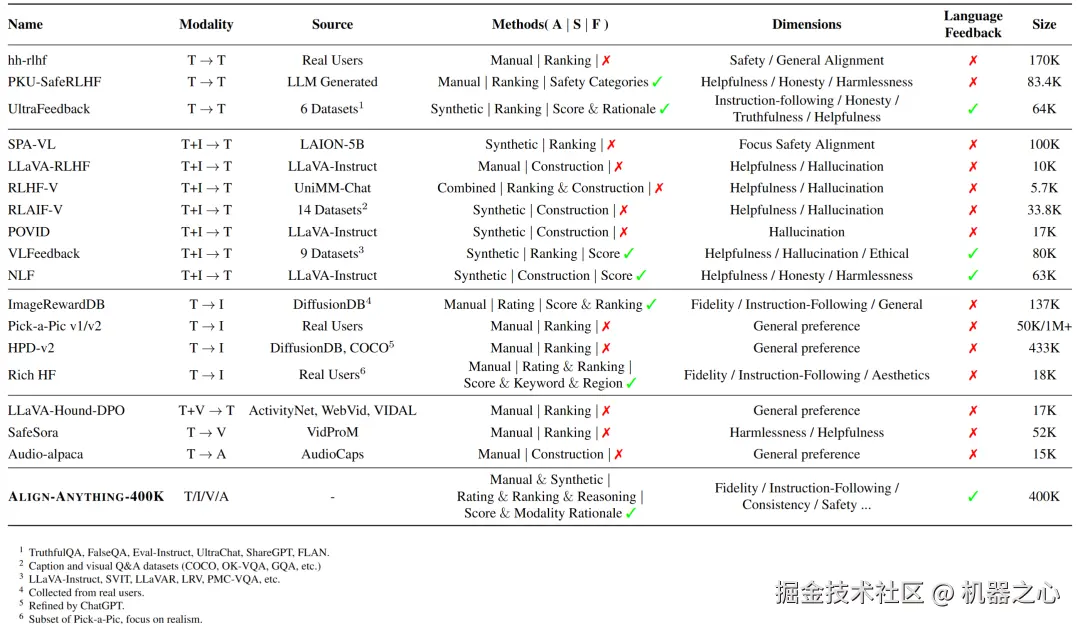 通过和目前现有偏好数据集的对比,北大对齐小组发现虽然随着大模型的能力逐渐向越来越多模态迁移,目前偏好数据集却缺乏细粒度的反馈维度且涵盖模态较少,同时缺乏一个合理的结构和纽带,将跨模态偏好数据集组织起来。