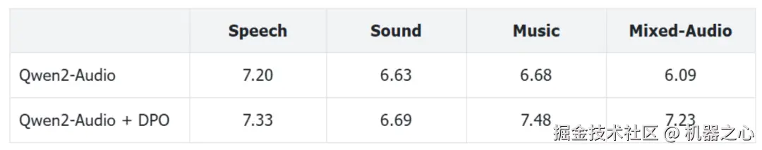 除了最经典的图文模态,北大对齐小组还在时新的音频文本混合模态上进行了对齐的有效性验证。Qwen2-Audio 是截至目前效果最好的开源音频文本混合模型之一,已在 AIR Bench 等多种类型的评测榜单上取得 SOTA 的表现。Qwen2-Audio 的技术报告中提到了对齐算法 DPO 在后训练(Post-Training)阶段的重要作用,然而,目前社区并不支持对于该模型的对齐微调。
