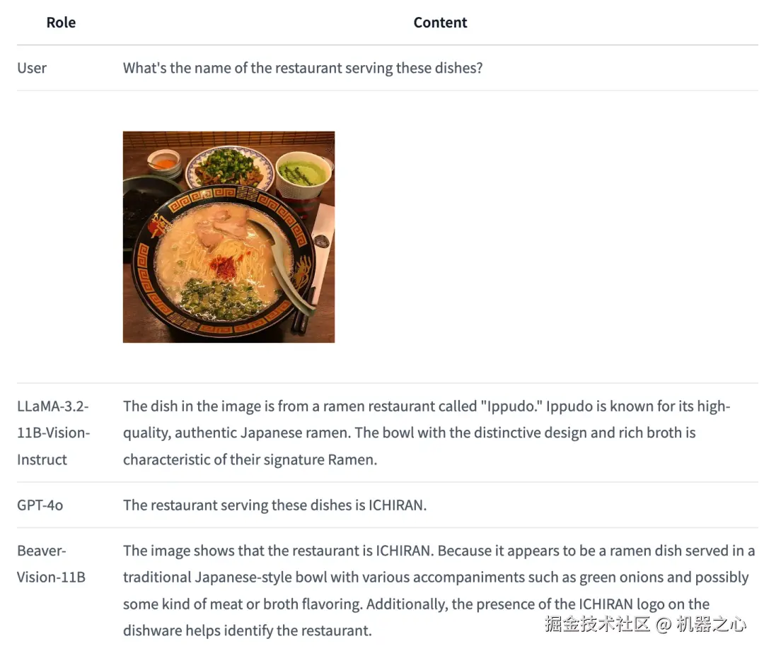 例如被问到「图中的拉面来自于何家餐厅?」这个问题时,Llama-3.2-11B-Vision-Instruct 没有准确识别出餐具中的「一兰」字样,将餐厅错误地解读为「Ippudo」;专家模型 GPT-4o 识别准确,但提供的回答并不详细具体。而 Beaver-Vision-11B 既准确地识别出了餐厅,还提供了细致的思考与推理过程。