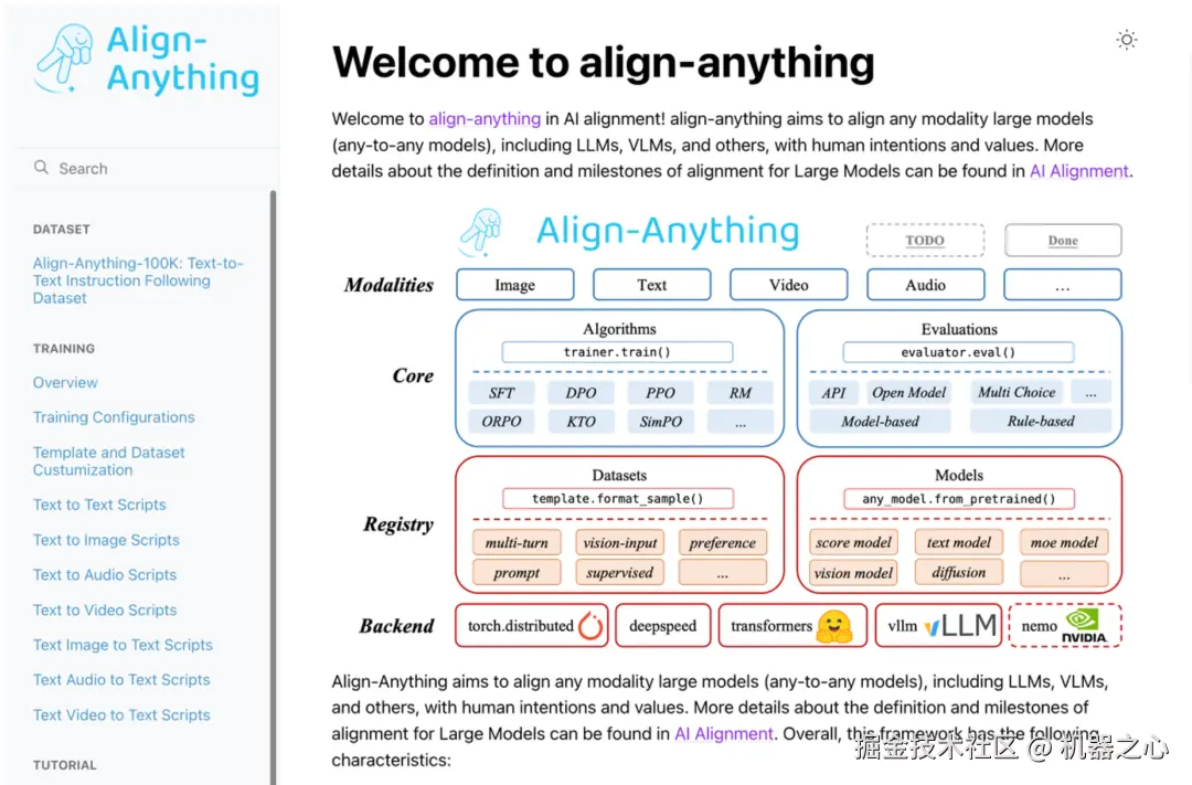 用户指南与代码传参高度可复现。对齐算法的训练启动往往涉及复杂的路径与训练超参数传递,而随着模态数的增多,算法训练启动愈发复杂,新用户往往难以快速上手。为此,北大对齐小组为 Align-Anything 开发了详尽的使用说明文档。