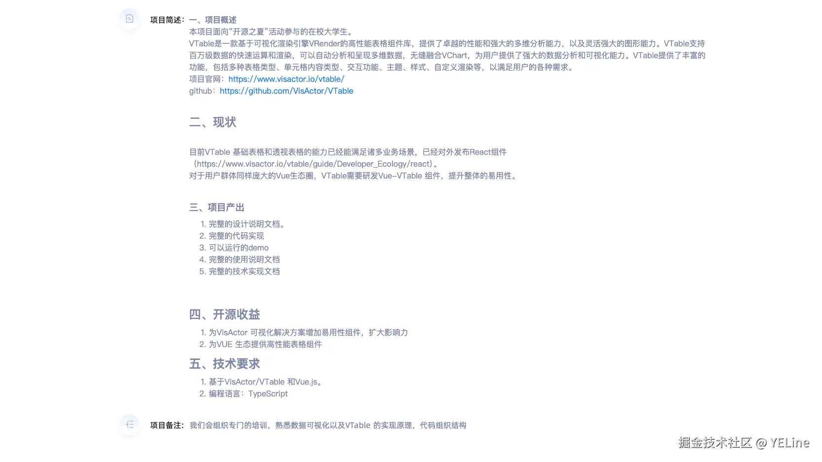 非常荣幸通过 OSPP 接触到 VTable 项目。作为一名仍在校的大学生,我一直希望能活跃在开源社区,励志成为懂点艺术的程序猿。前端开发正是我兴趣所在,VTable 项目为我提供了一个完美的契机,不仅让我深入了解开源项目的开发流程,还让我有机会通过代码为社区贡献力量。