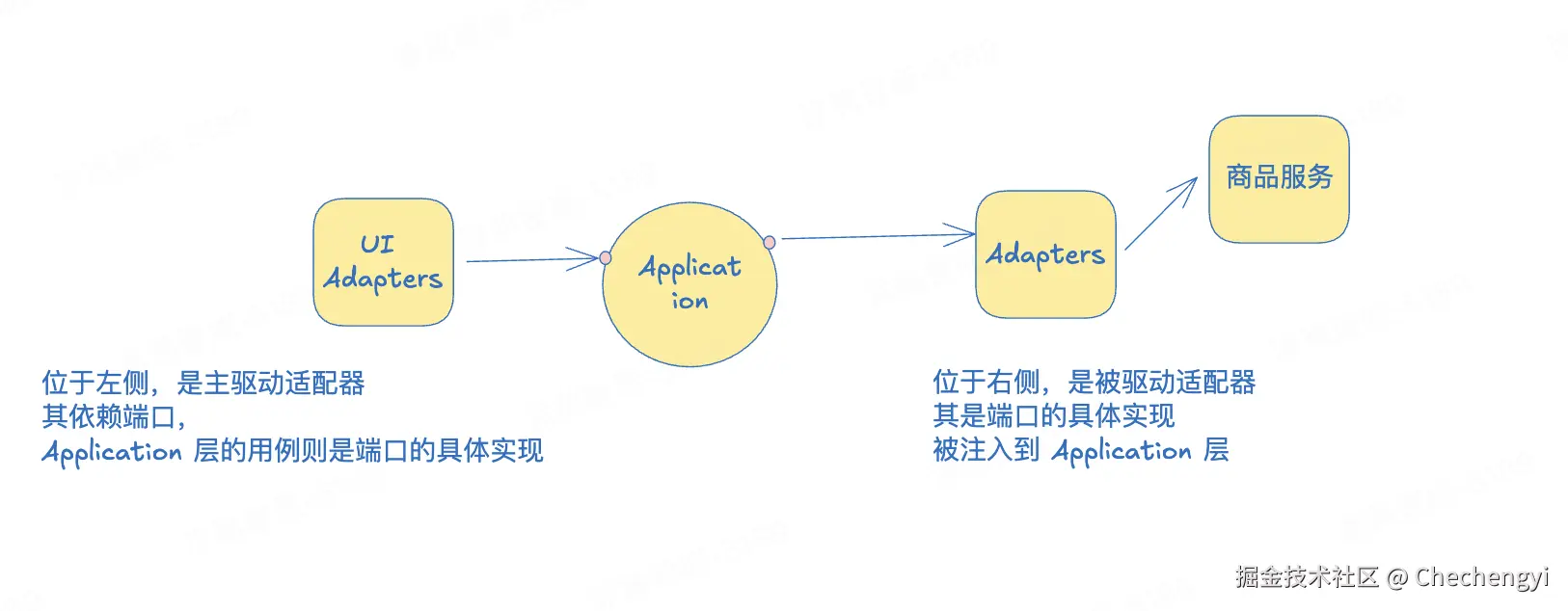 从上图的例子可以看到,对于像 UI 界面这种调用 Application 层的操作,Application 层负责实现接口。对于 Application 层需要调用其他三方服务,适配器就是一个实现了调用三方服务的接口,然后注入 Application 层