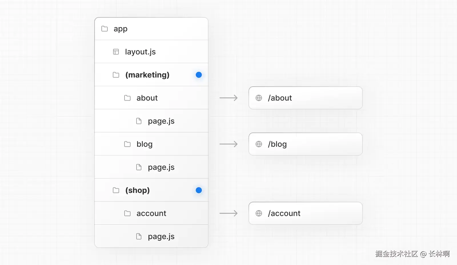 在 app/ 下,目录名称通常会被映射到 URL 中,但你可以将文件夹标记为路由组,阻止文件夹名称被映射到 URL 中。
