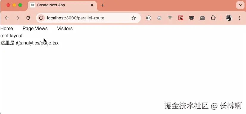 app/parallel-route/layout.tsx的代码如下:import Link from "next/link"; export default function RootLayout({ analytics }: { children: React.ReactNode, analytics: React.ReactNode }) { return ( <> <nav className='flex items-center gap-4'> <Link href="/parallel-route">Home</Link> <br /> <Link href="/parallel-route/page-views">Page Views</Link> <br /> <Link href="/parallel-route/visitors">Visitors</Link> </nav> <h1>root layout</h1> <div> {analytics} </div> </> ); }app/parallel-route/@analytics/page.tsx的代码如下:import React from 'react' const page = () => { return ( <div>这里是 @analytics/page.tsx </div> ) } export default pageapp/parallel-route/@analytics/page-views/page.tsx的代码如下:import React from 'react' const page = () => { return ( <div>page-views page</div> ) } export default pageapp/parallel-route/@analytics/visitors/page.tsx的代码如下:import React from 'react' const page = () => { return ( <div>visitors page</div> ) } export default page