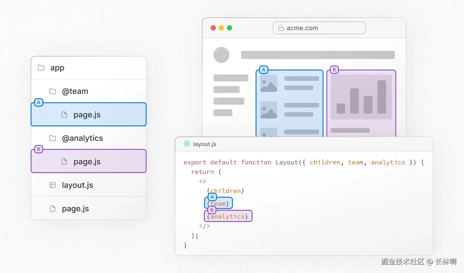 平行路由是使用命名插槽创建的,插槽是按照 @folder 约定定义的,比如在上图中就定义了两个插槽 @team 和 @analytics。