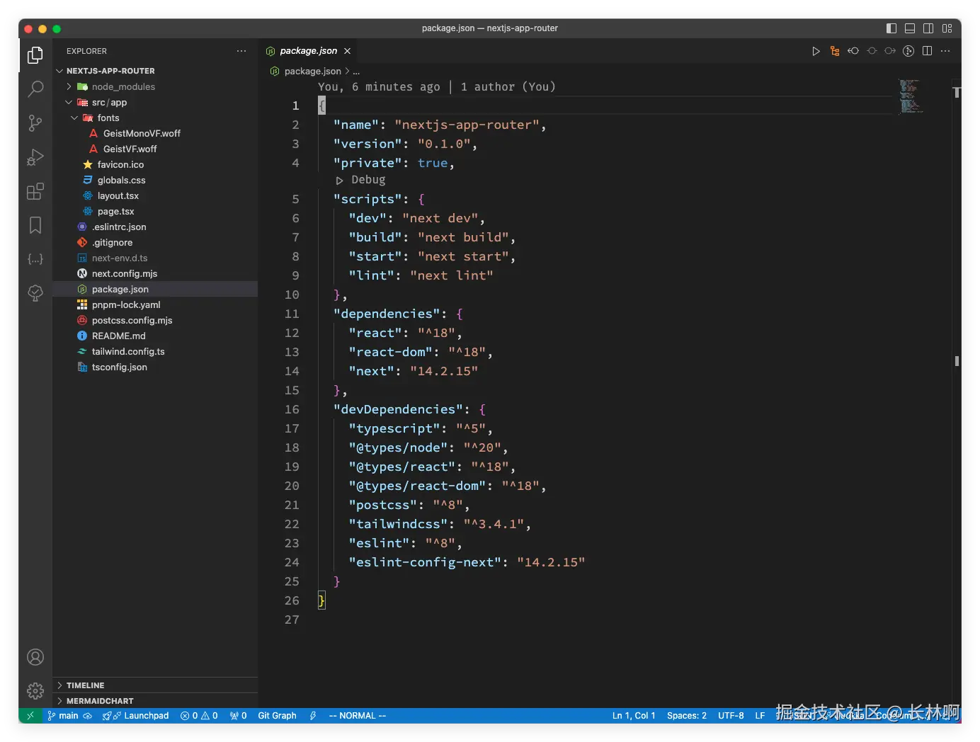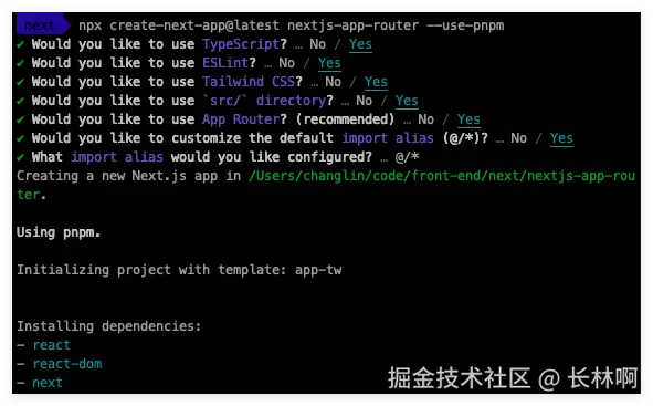 使用命令 npx create-next-app@latest nextjs-app-router --use-pnpm 创建项目(--use-pnpm 表示使用 pnpm 创建项目,如果没有 pnpm,也可以使用 npm 或者 yarn);可以选择你自己喜欢的技术栈,我的配置如下图: