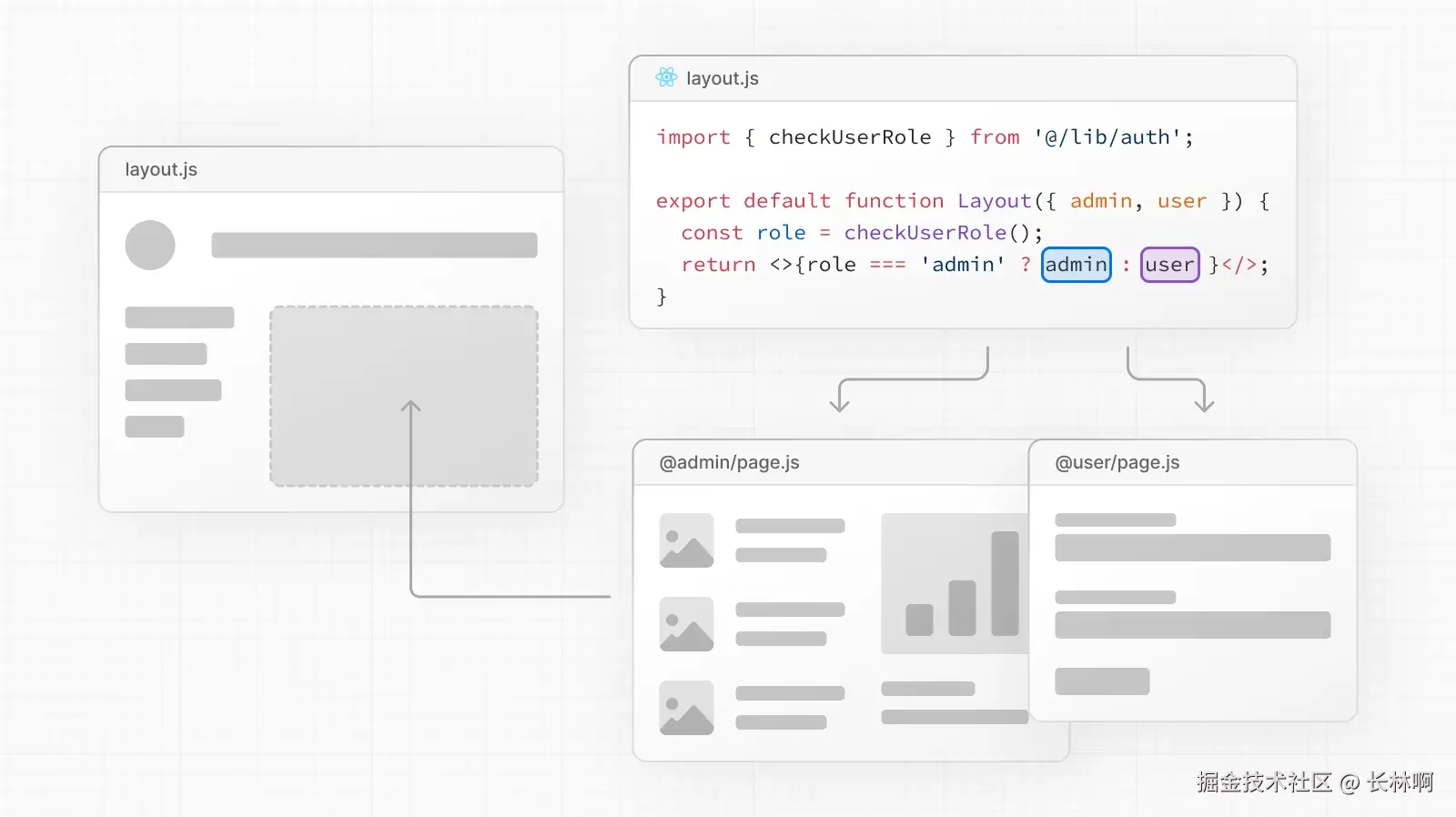 在一些后管理系统中,你可以通过使用平行路由基于某些条件 (如用户角色) 有条件地渲染路由。例如,为 /admin 或 /user 角色渲染不同的仪表盘页面: