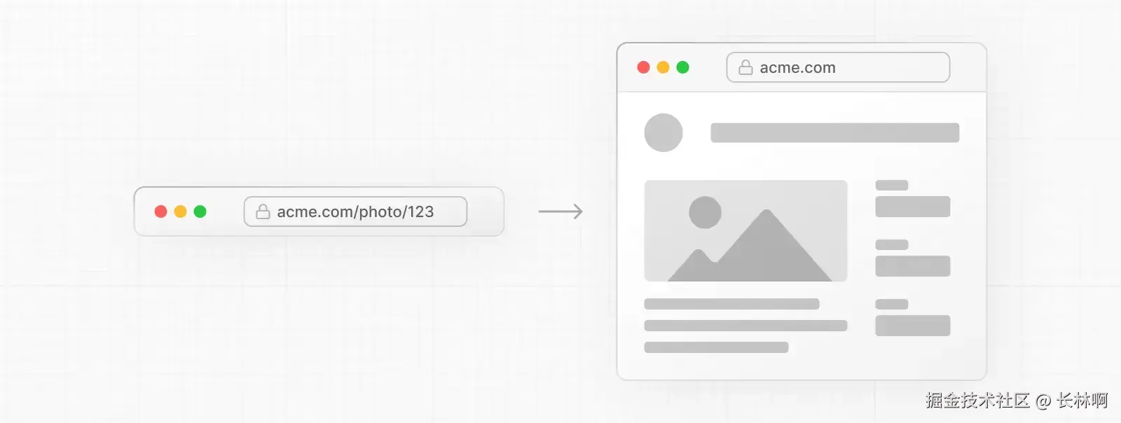 上图左侧就是在一个图片列表中,当点击一个图片信息 /photo/123 的时候,结果就是右边这种呈现形式。但当你将地址栏的链接分享出去的时候,就会得到下面的效果: