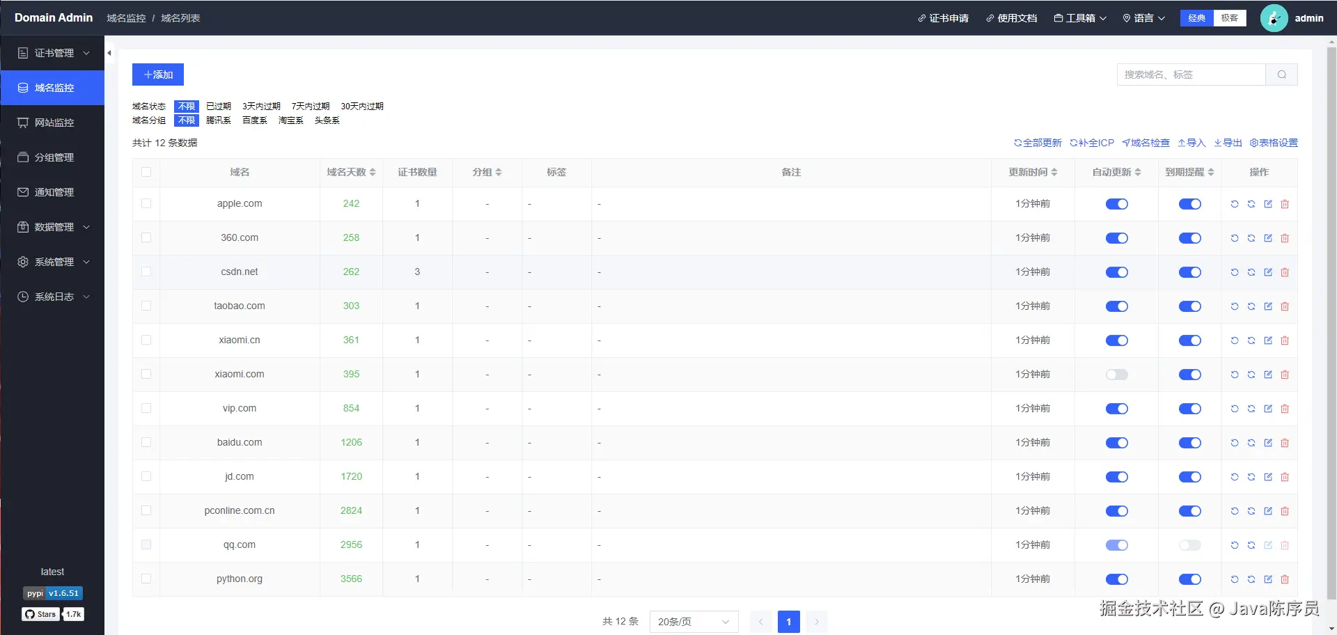 Domain Admin —— 一个基于 Python + Vue3.js 技术栈实现的域名和 SSL 证书监测平台。用于解决,不同业务域名 SSL 证书,申请自不同的平台,到期后不能及时收到通知,导致线上访问异常,被老板责骂的问题。