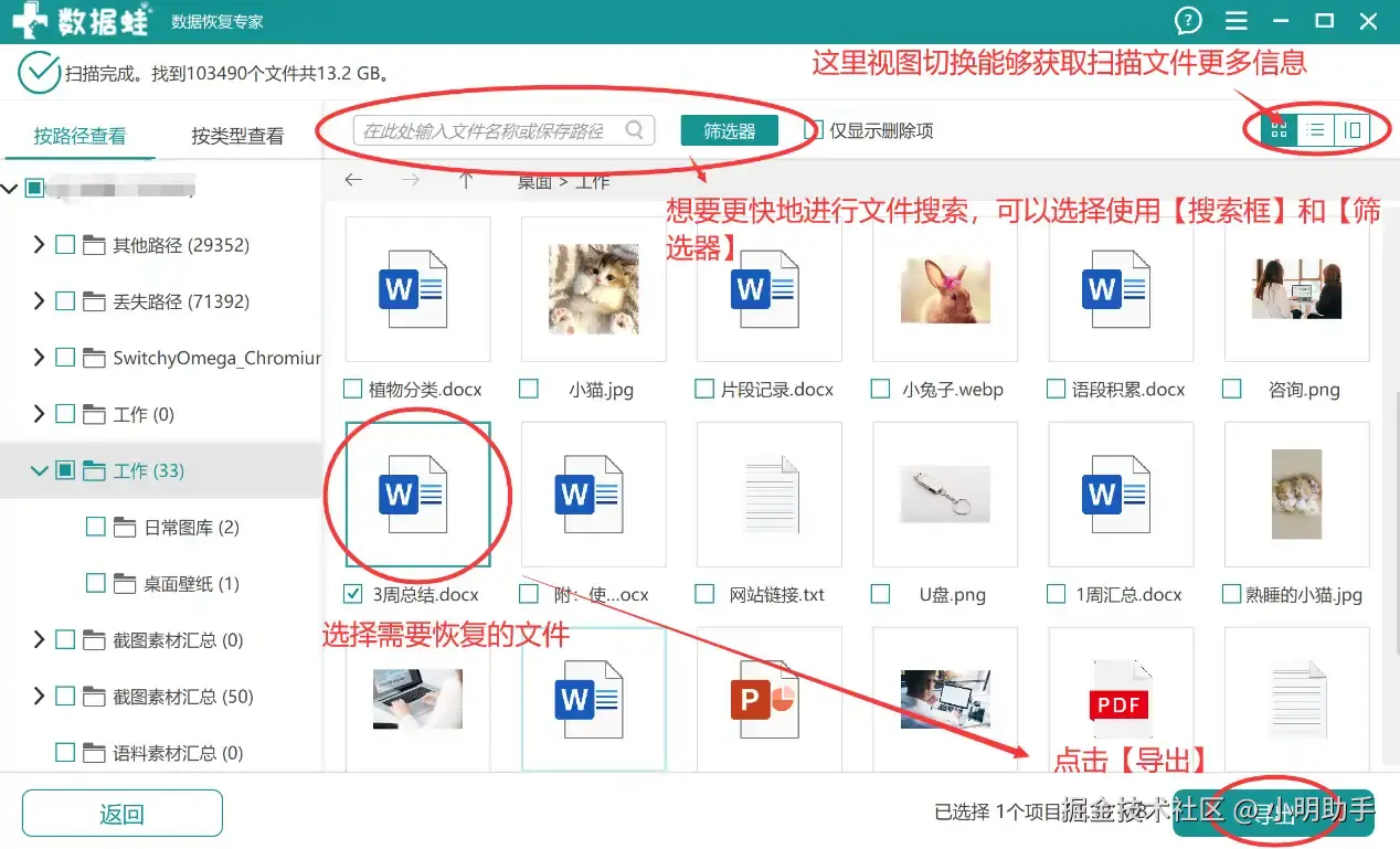 第2步: 扫描结果出现后,选择自己需要恢复的文件后,点击【导出】。