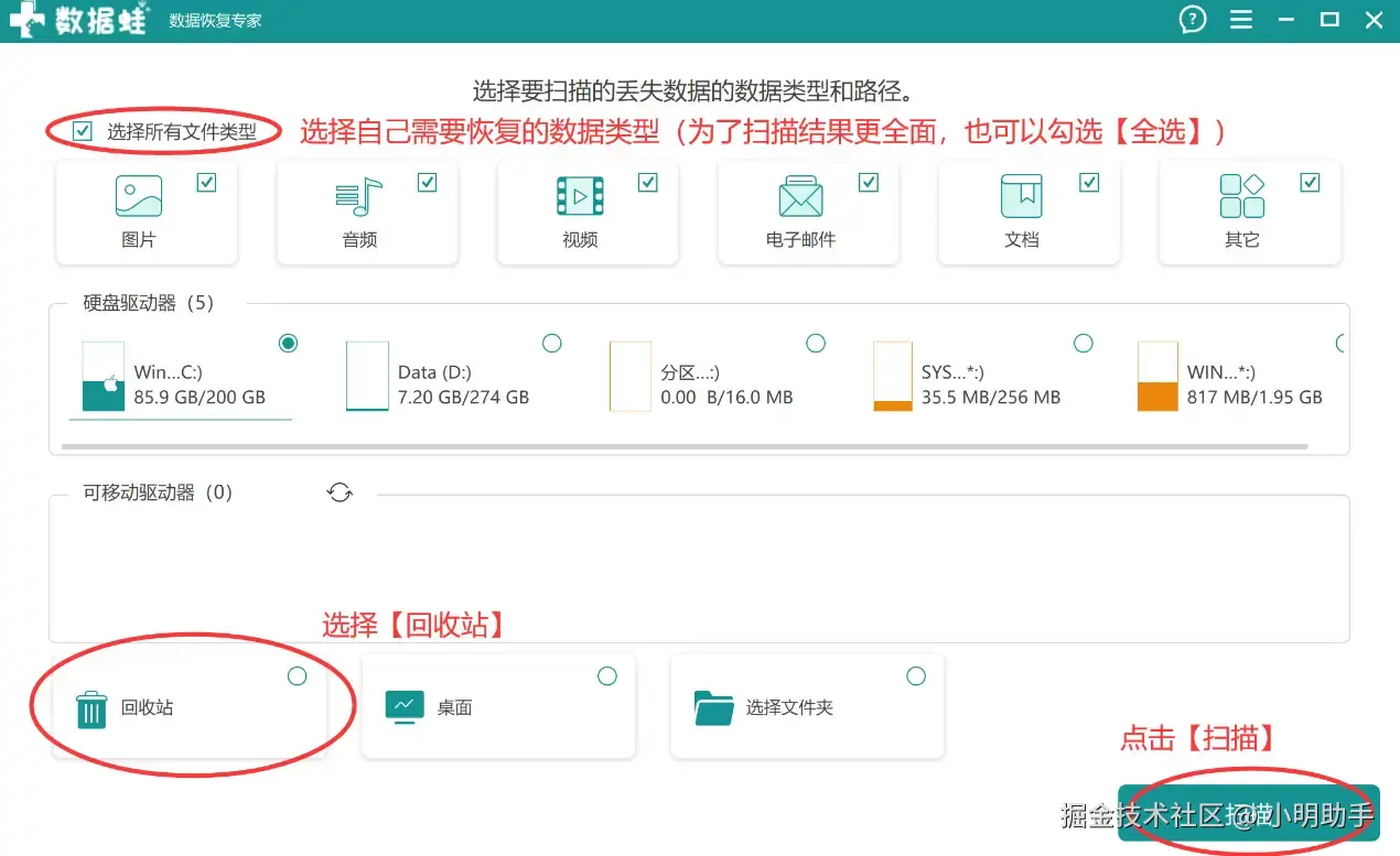 第1步: 打开软件后,在主页面选好需要恢复的数据类型和【回收站】,最后单击【扫描】,等待扫描结果。